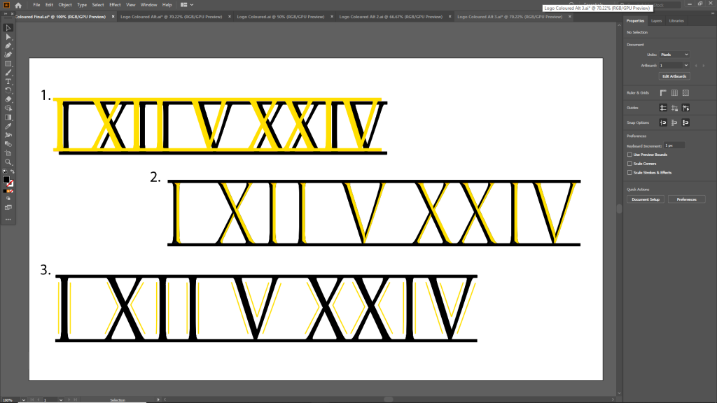 In the second design I used the different segments of the numerals and coloured them in different shades. This creates a similar sense of depth as the first design however can also be seen as indented which correlates with the inspiration of this design and font which is the Trajan Column where text was etched into stone.
