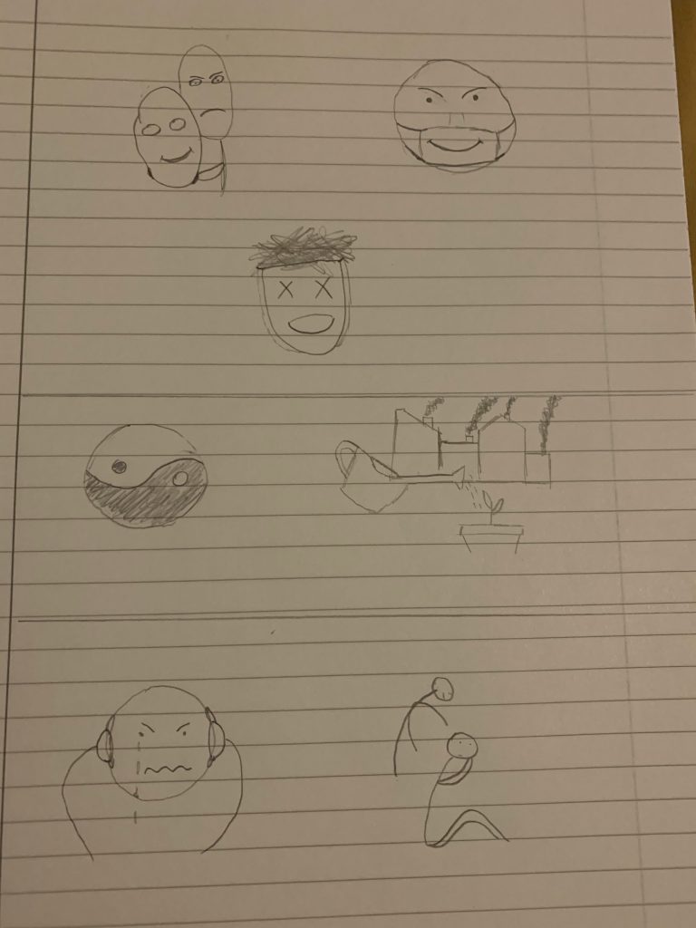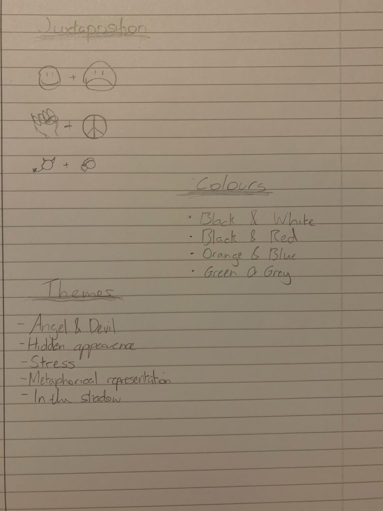 The subject of my poster is ‘The Duality of Human Nature’, therefore, the concept of the poster will revolve around humans and feelings. I created a few sketches and notes to give a sense of what the poster should look like.
