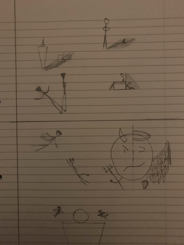 Juxtaposition involves the two sides of duality and how I will physically depict them. The first sketch is the two sides of duality shown through emotions on a persons face. to do so I would combine both emotions, half and half or side by side, on a single humans face. this image would represent the parallel between conflicting emotions. The second sketch represents the two topics, violence and peace, the sketches I chose for this was a fist and a peace symbol, however, I believe it would be better to use a single object that combines both topics. The last sketch depicts a devil and an angel. These two fictional beings were fabricated by humans and can be seen as a representation of humans good and evil.
