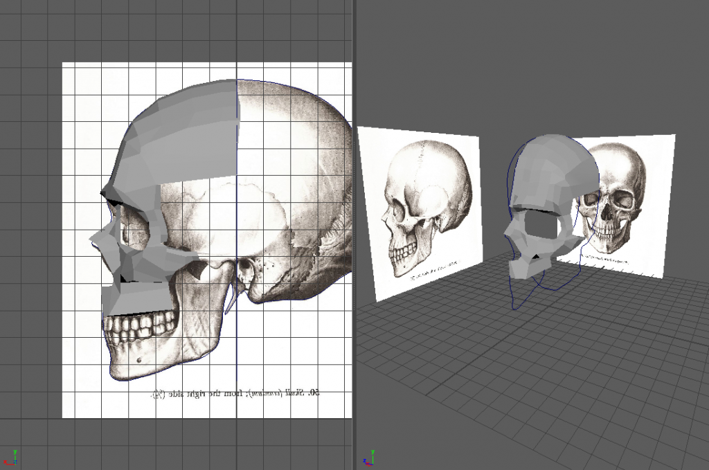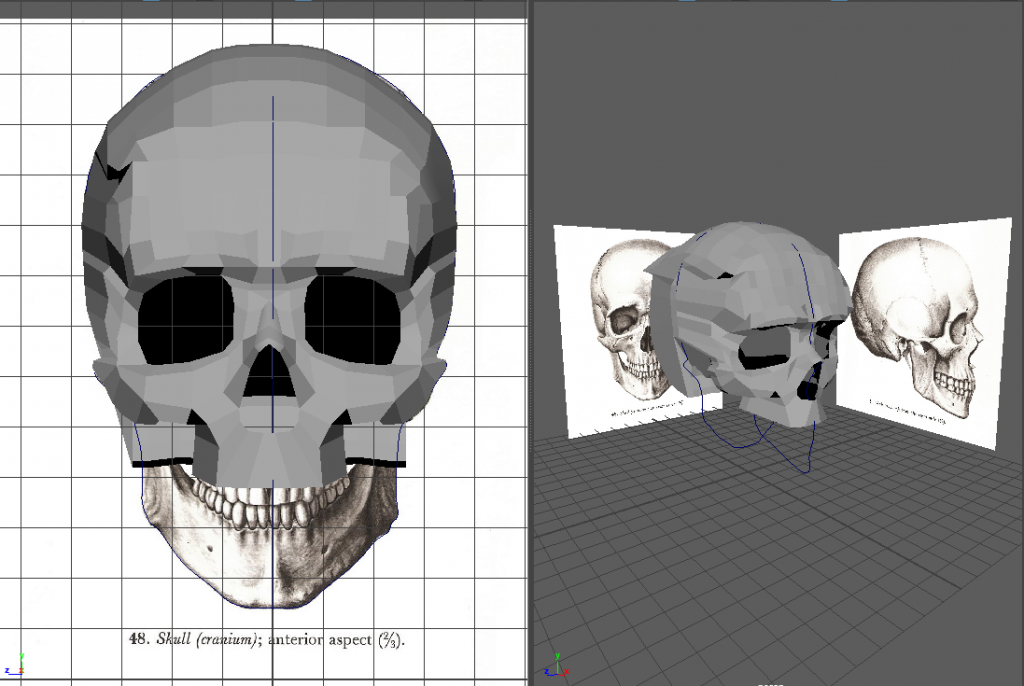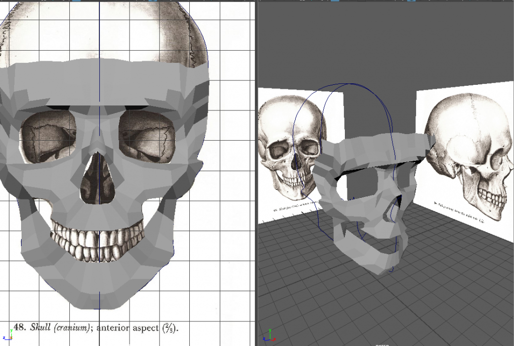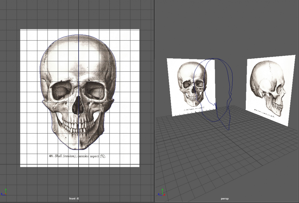 As a start I had two images as a reference that I would import onto Maya to create the general shape of the skull. I traced an outline of both images to get a rough border for my skull, in the future I would realise that these two axis were not enough to get a good scope of what the skull would look like 3D.