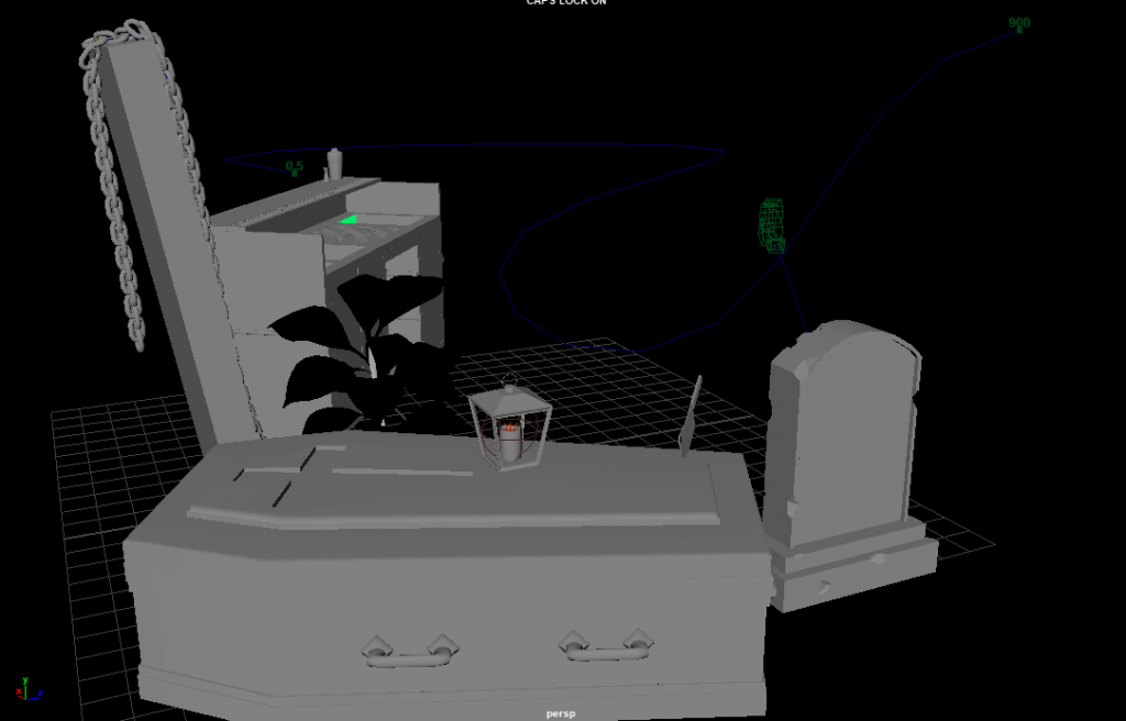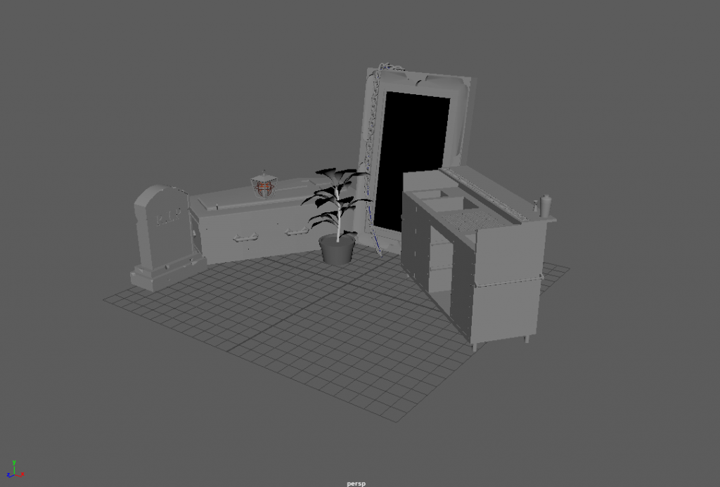 With the smaller objects, since they would be hard to show separately, I placed them on top of the larger objects. I also made sure the placement was somewhat appropriate, the cocktail shaker and jigger was placed on the bar station and the lantern and knife was on the coffin.