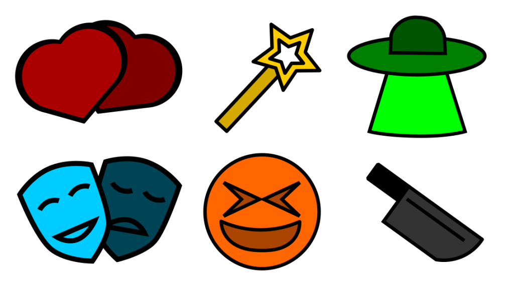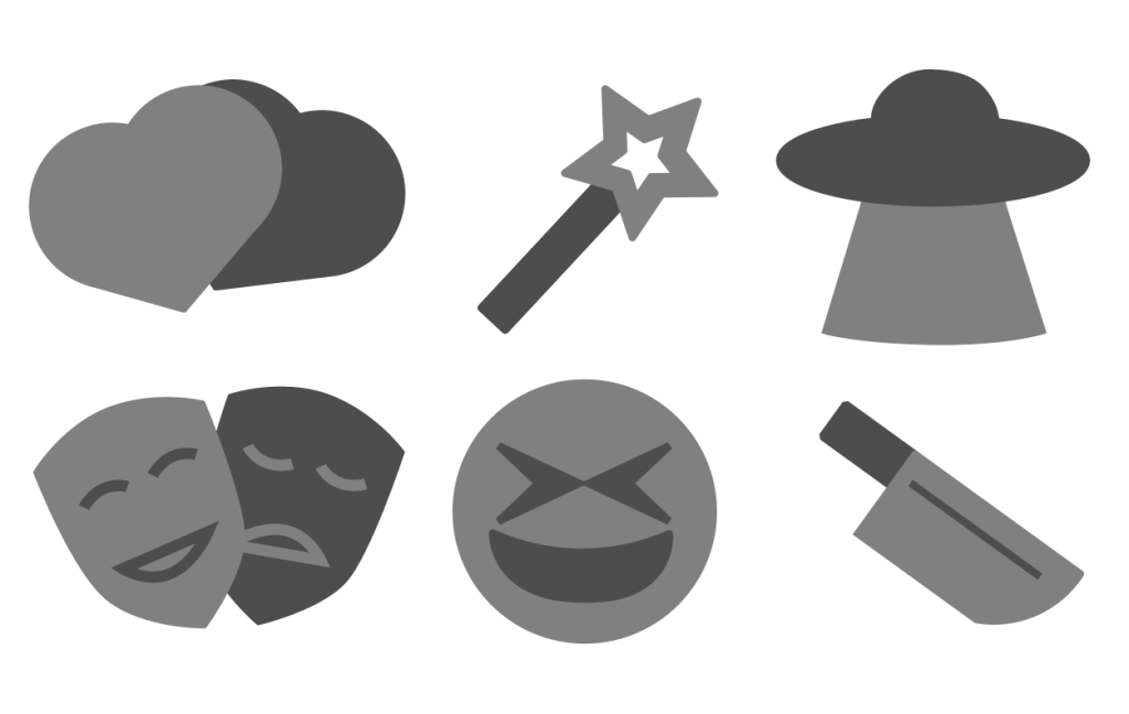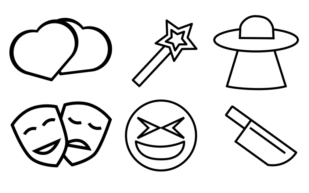 The icons below are used to visually describe the different genres offered by the website. In order to do this the icons must differentiate themselves from one another using different shapes and colour. In the first example by each icon having a different colour it is made easy to tell the difference of each icon with a glance, but more importantly by having a distinct colour if the colour was to be repeated that repetition would then be linked back to that colours theme/genre. The later two examples, although lacking colour, can still be differentiated due to the difference in shape. These examples could be used in situations where adding too much colour to a page would take away from its focus. Keeping the icons to the same shades of black and white make sure they don’t stand out too much but still let the reader tell them apart due to the shapes.