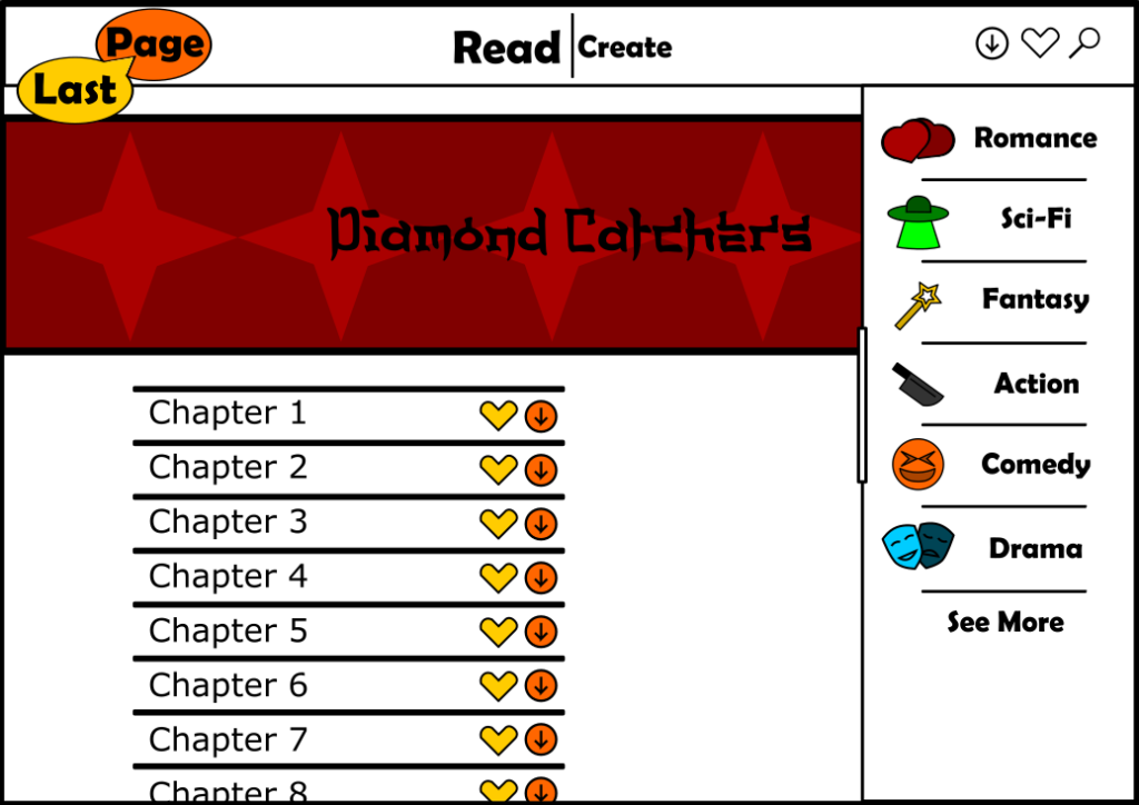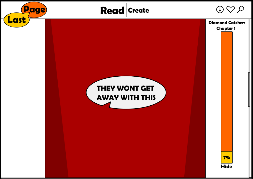 The Images below display several different pages on the Last Page website. The main purpose of the website is to allow readers to read comics and help creators create comics, this is highlighted by the categories at the top of the page. At any point the user is able to easily chose whether they want to read or create, which section they choose is also shown by enlarging that particular name as well as the websites logos colours swapping, this can be seen as small multiples as small changes are made allowing for the users understanding. When reading on the right hand side of the screen the different genres are displayed, these genres are easily differentiated by their distinct colours supporting Tufte’s theory on the use of colour. This genre section can be minimised if the reader choses to allowing them to focus on other sections of the webpage reducing clutter as is the purpose of layering and separation. For example once a comic is chosen the reader can then choose which chapter they want to read by viewing the ordered list and are also able to download or favourite. When reading a chapter a readers progress is also displayed next to the comic, an example of Tufte’s space and time theory as progression is displayed.