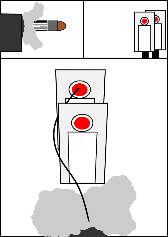 I believe a comic isn’t a comic without narrative of space over time, comics tell stories and although they may vary all stories involve time. The example below is an example of a page/section of a comic of which would be hosted on the Last Page website. The comic tells a story of a gun being fired and the bullet curving around a target. The time in this piece starts from the bullet just exiting the gun to it hitting the target, this time is then visualised by the comic as the objects in the scenes change location. By the separation through borders of each scene it can also be inferred that time is changing in each scene, and inversely one panel being bigger that the others can be seen as a big event all happening at once. In this instance the time frame is small and therefore there isn’t many panels, but if this event was to happen over hours for example, you could expect many more panels as each panel adds more time to the story. One extra detail to mention is the motion lines as they are the main indication of movement within this still image.