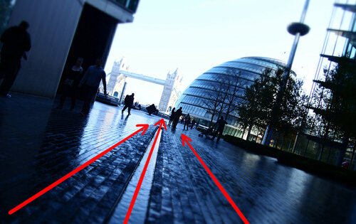 This is a quite centred composition, as a common trait with buildings, it utilises its symmetry to help create attractiveness and also along with leading lines helps lead the viewers focus to the main subject (being the man) as all lines, as shown below, lead down into the centre.