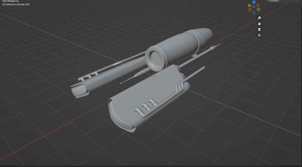 One main thing I wanted to change before applying the finishing touches to this design was changing the thrusters. This was to be expected as the thrusters I made at first were mostly just placeholders, meant to eventually be changed. The plan was to create thrusters similar to that of an aircraft, featuring moving parts that adjust its power, this would of course be more complex than most other parts of the ship and therefore require some trial and error.