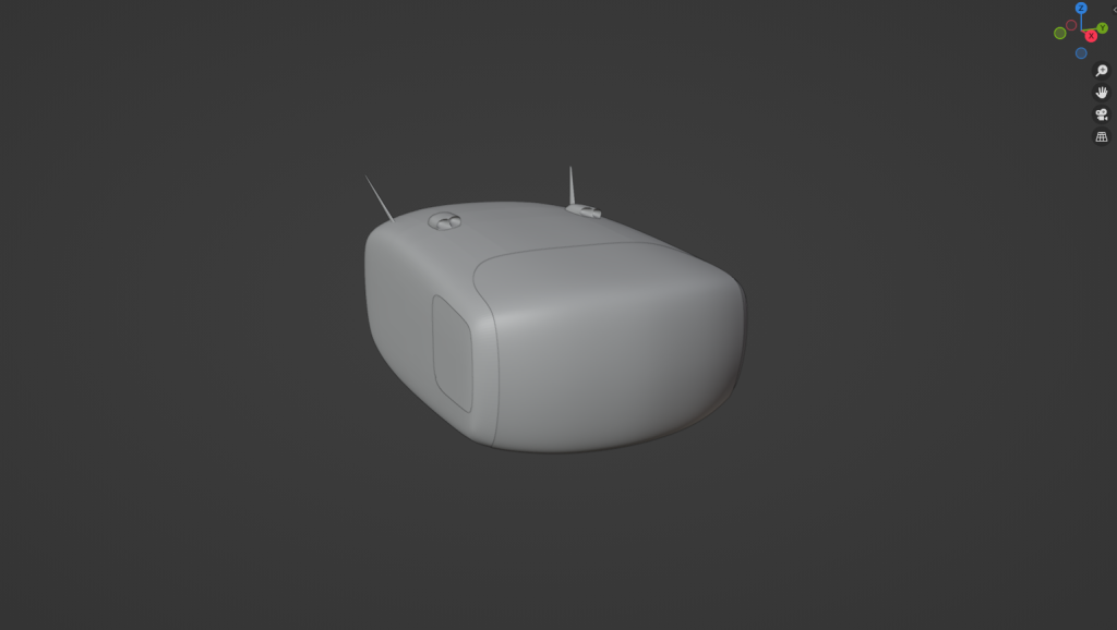 My first iteration of the ship had a box-like look to it. The front panels would be made from a glass texture and act as the windows the driver would look through, I noted that at the time having these panels curve may create problems with reflections when it came to rendering. Additionally, on the top, I added some intakes and fins, these add an additional layer of detail making the design look more like an actual ship. By giving the ship a large width it allows for a good amount of internal space for the driver’s cockpit. However, I wasn’t personally pleased with the shape as I found that it didn’t look very aerodynamic or appropriate for a single-seat cockpit.