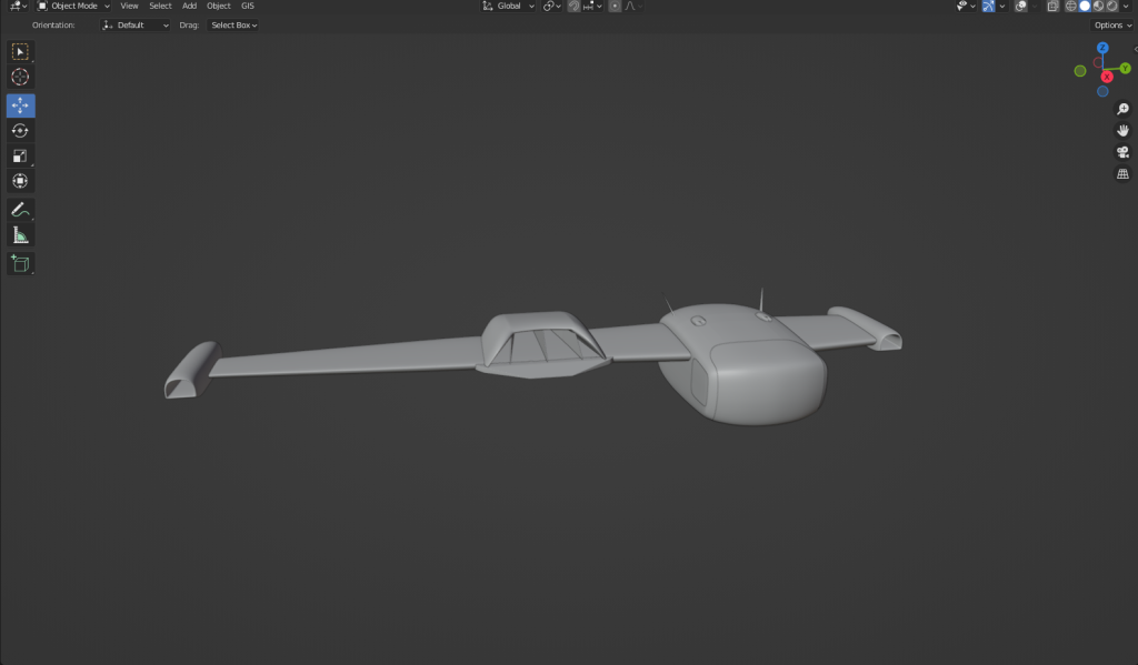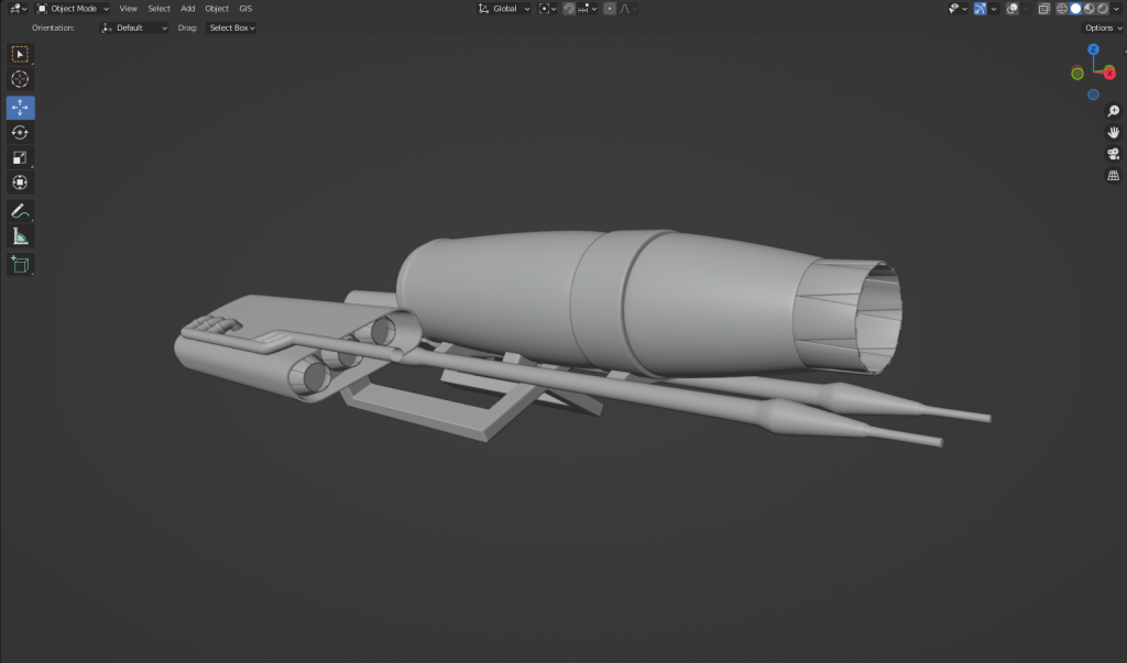 To complete the ship’s design I added a large wing that would serve as the main device for propulsion and movement. Influenced by the reference images the design features engines on either end of the wing, followed by a large intake in the centre acting as balance. At this stage I didn’t feel fully confident with this complete design, although the look was definitely a big part, the main reason was due to poly count and subdivision. Polycount (polygon count), refers to the number of polygons or triangles that make up a 3D model. In Blender, 3D models are constructed by connecting points in 3D space to form polygons which define the shape of the object. The more polygons a model has, the more detailed it can be, but also the more resource-intensive it is to render and display. Subdivision is the process of dividing a polygonal mesh into smaller and more detailed parts by adding new vertices, edges, and faces. This technique is used to refine the shape and smoothness of a model’s surface, adding detail. In Blender, you can use a subdivision modifier to apply different levels of subdivision to an asset. For this asset in order to make the shape not appear low poly or blocky, I applied various levels of subdivision to the different objects it was made of. I should note that the method in which I went about subdividing was not the most suitable and therefore I required excessive amounts of polygons to make the ship look polished, due to the large poly count it would be difficult to render this model, especially with good lighting. I came to the decision to scrap this model as it would create a lot of problems further on in development. From this problem, although I would suffer a time loss, I was now better prepared when it came to creating assets for the scene.