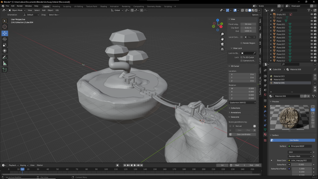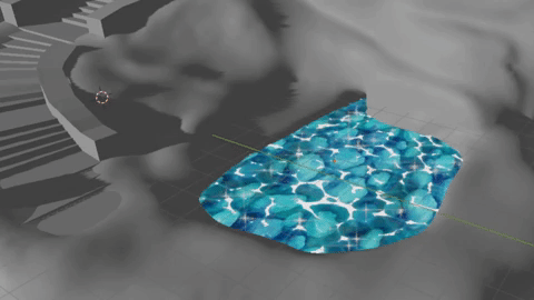 The next step involved filling in the pond and further experimenting with the setting. I added a stone wall to the back of the scene using the same methods I did to create the floor, I made sure to take into account how the pond flows in and out of the area by adding the opening at the bottom. For the pond, I just used a plane and would rely on its material nodes to make it look more realistic.