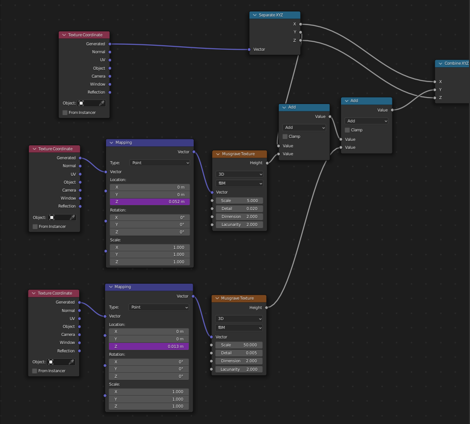 At this stage, I had a good basis for the material but I wanted to add some more detail so I expanded upon this node arrangement. Below is the improved node setup from left to right.