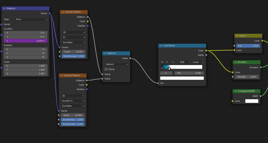 I knew to start I would want some patterns to create something akin to spume, therefore I tried some of the different texture nodes and quickly worked out that a Voronoi texture would be the best. by combing two Voronoi nodes together with the subtract node I could create the varied sizes of the black dots and with the colour ramp, I could make the shades less faded.
