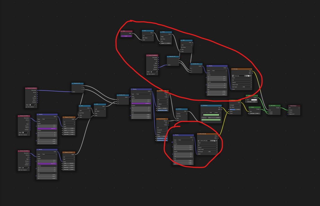 Next, I decided to add some more textures, the current problem I had was that the previously black shapes were too rounded and therefore didn’t give the feeling of a moving body so I decided to try to edit the vector properties of the previous textures in hopes to animate them. This will better represent the motion that would appear in this environment even if just in an image. In this setup, I used Musgrave textures with changing z-axis to evolve the simple Voronoi texture by giving it more life-like water properties.