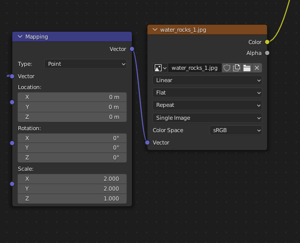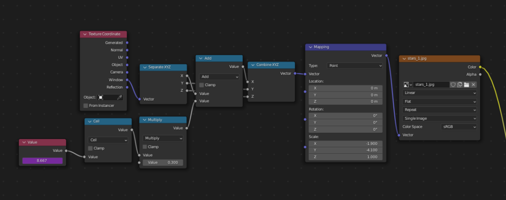 The second is a VFX-style star animation. To complement the style that I was developing I decided to use a technique often seen in animations to simulate sparkling stars. I started with a simple royalty-free image of stars and then through the mapping of the texture I used a combination of math nodes to randomly move the location of the star texture on top of the pond texture. Although the final piece will not take the form of an animation this random movement will help capture the essence of reality with its movement.