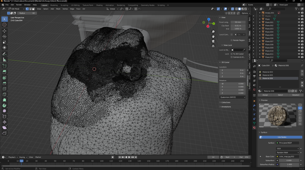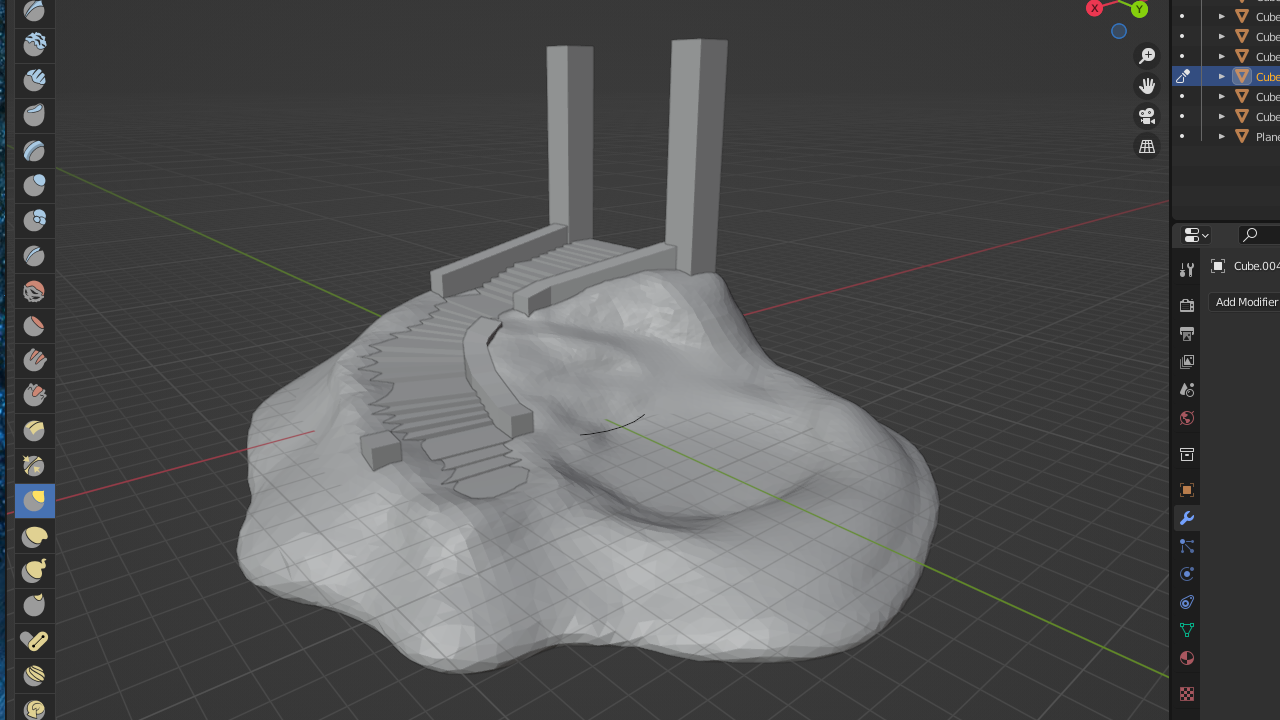 One more thing I would address before moving on to adding materials was the topology of the original setting. Due to using the sculpt mode and Dynamesh the poly count of the area became quite large and ununiform. To fix this I would have to take some time and re-mesh the object. This is a mistake that will cost some time and could have been avoided with different methods such as using the multiresolution modifier, something I will definitely consider going forward and next time.