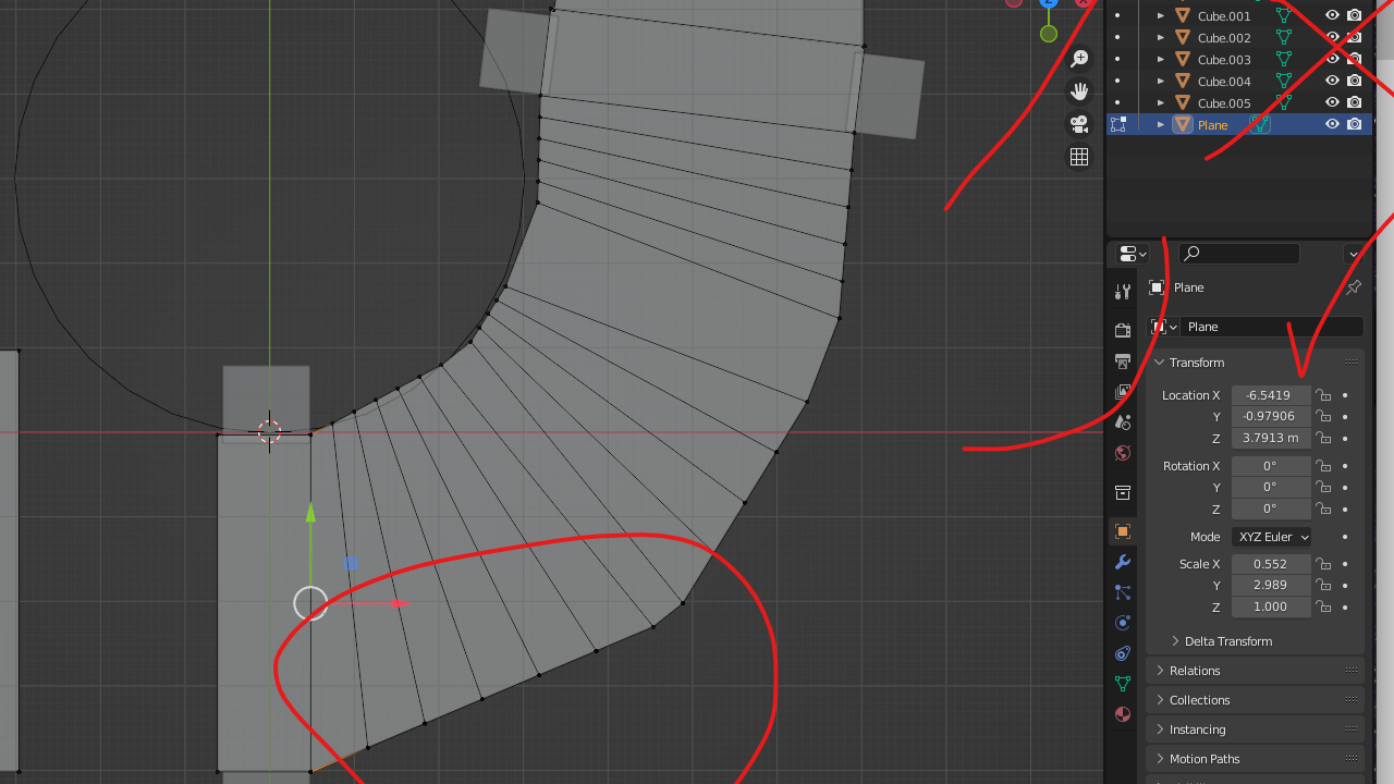 To start I simply created a circle that would act as the location of the pond (I will refer to these simple objects as placeholders or what they will eventually be from now on). I then placed some planes in a formation around the pond increasing in size to imply its direction forward. Along with this, I added some incline to the path as I decided it would look better as a stairway.