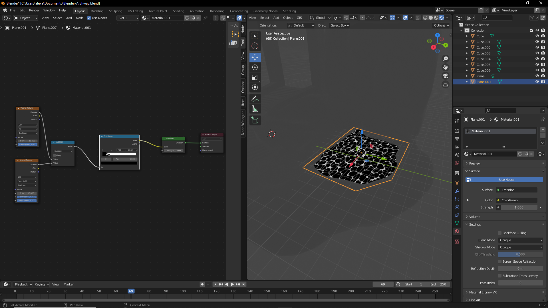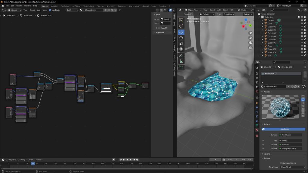 In Blender you can create materials using the shader editor, this provides you with many different nodes that can allow for many different unique properties to be applied to the object. As with many parts of Blender, I am still trying to learn this editor therefore this part of the development process took a lot of back and forth and testing to find out what works.