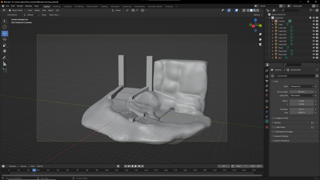 I now started to add some ground to the scene, for this I started with a simple cube and then used sculpt mode, with dynamic topology and the basic draw brush, to expand out the cube into the shape you can see above. I also added some more fencing to the sides of the path as it helps better illustrate the direction of the path especially when the scene is more densely populated. At the end of the path I planned to have some type of gateway however, I had not yet fully decided therefore for the time being I would just have two large pillars.