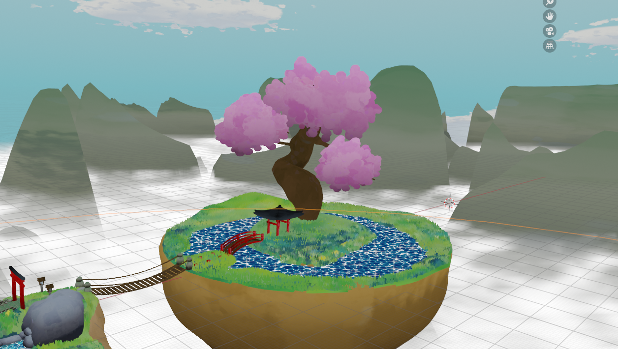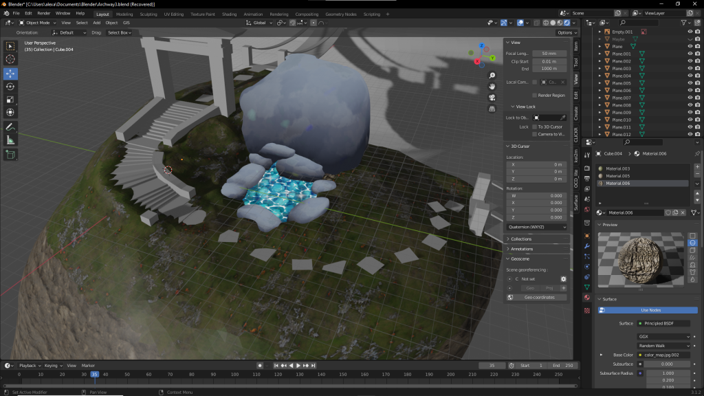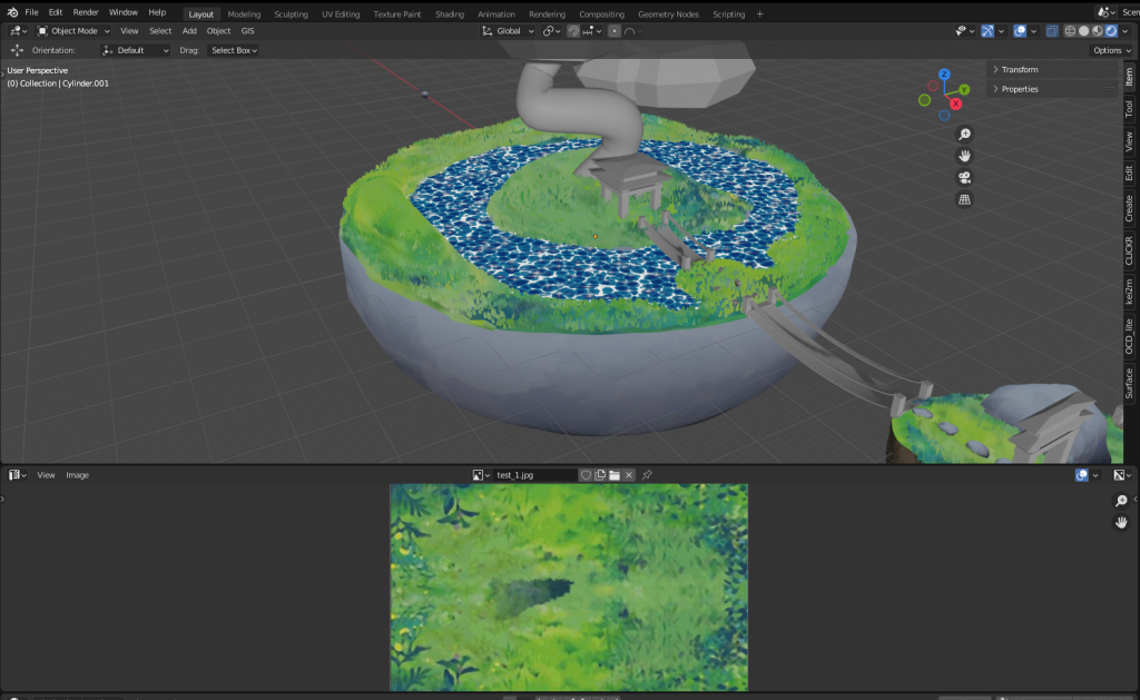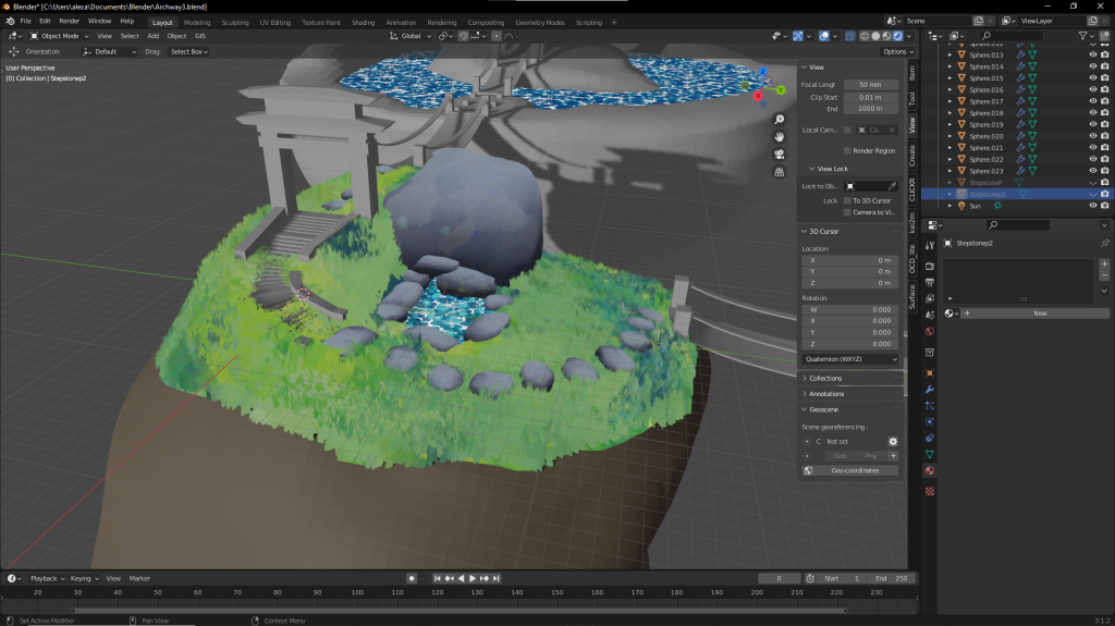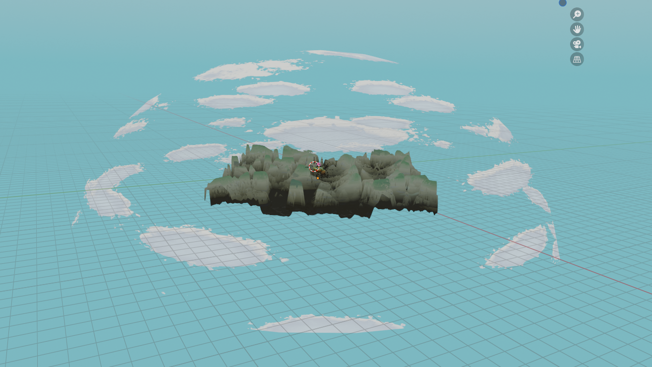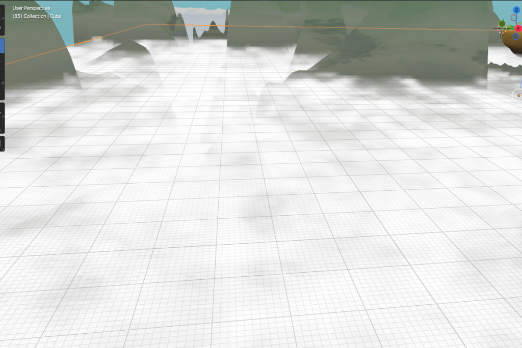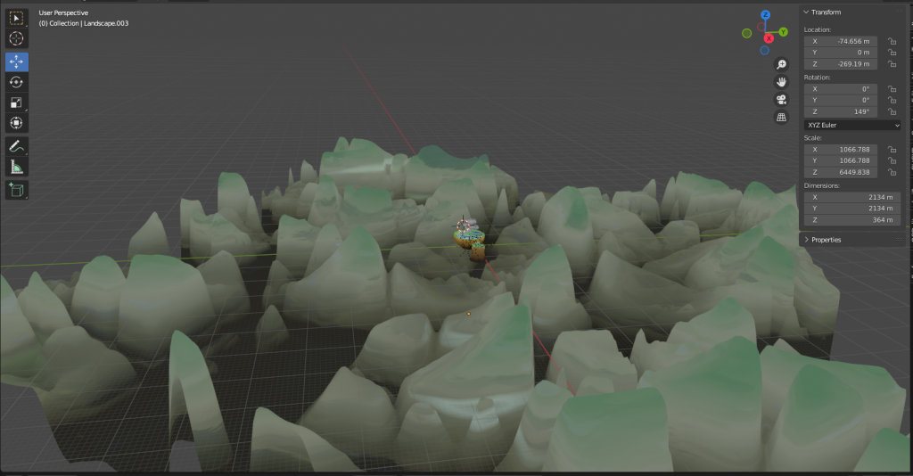 After adding some more materials like done above I was close to done with the setting as a whole, however, I wanted to tackle how I would approach the background. I did think of using skyboxes however that didn’t feel like enough so instead I created a bunch of distant mountains. I did this with a displacement modifier on top of a plane and then added a material and due to the properties of the materials they created a nice illusion of vegetation on the mountain-tops.