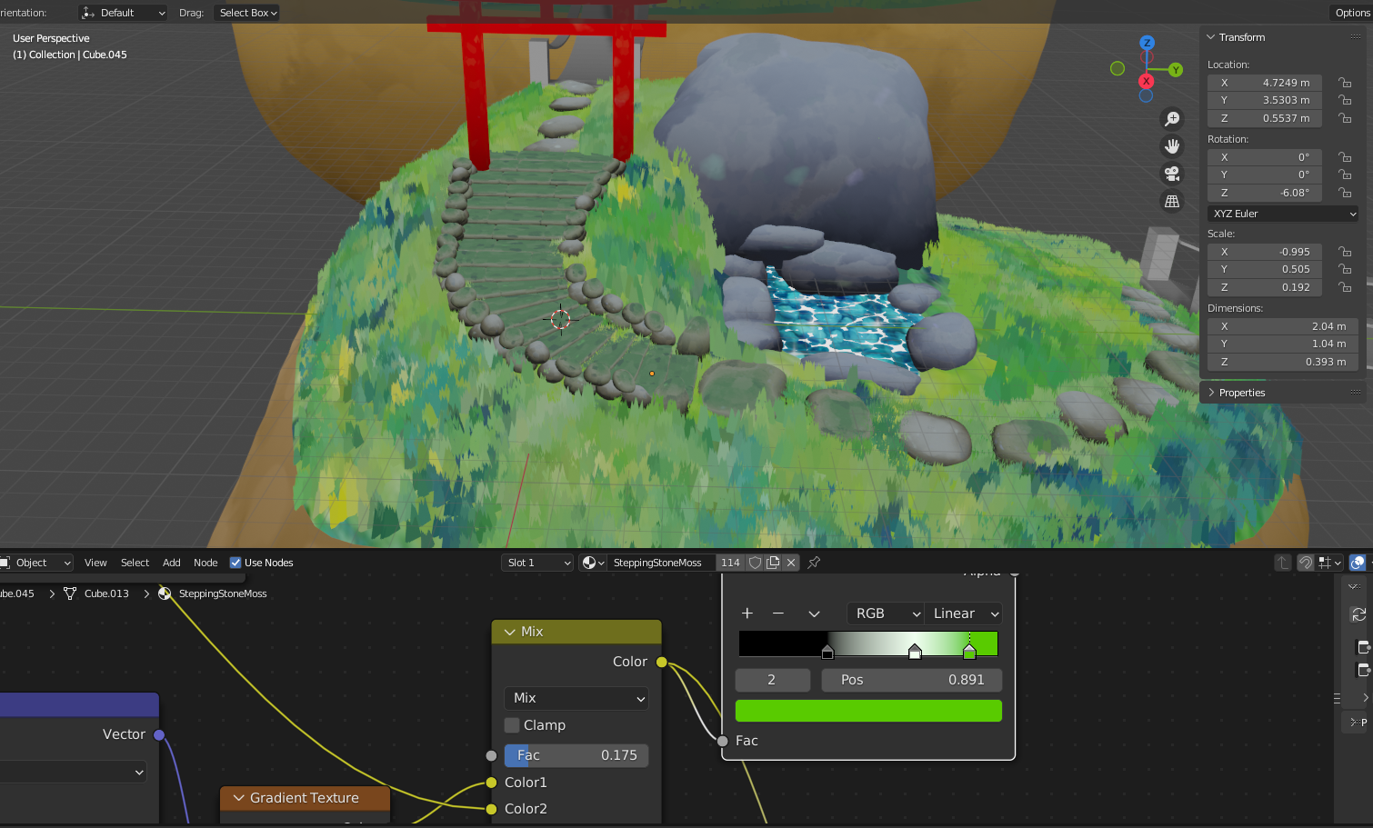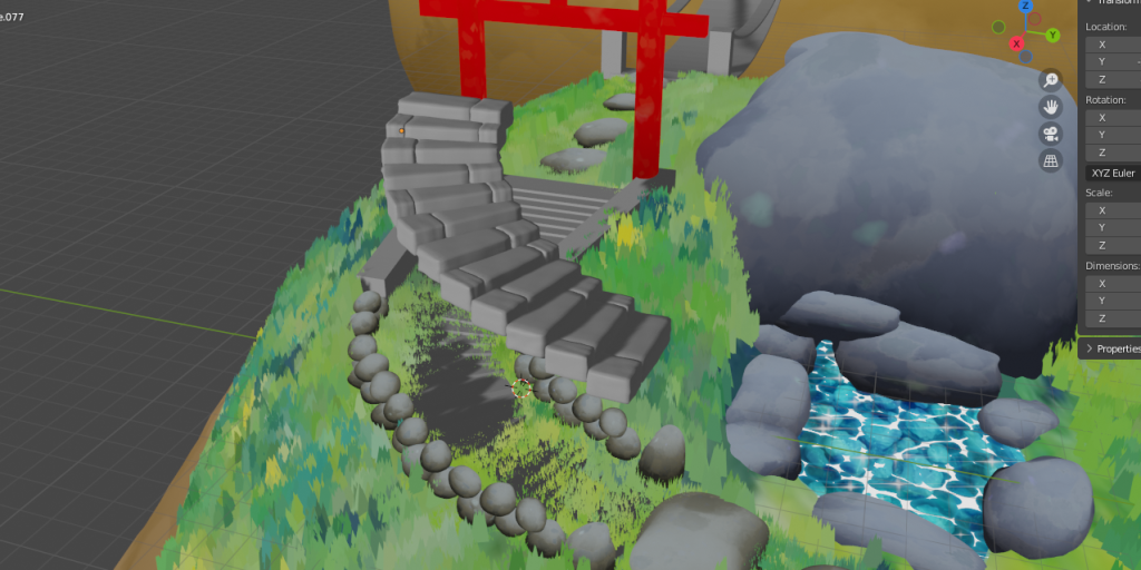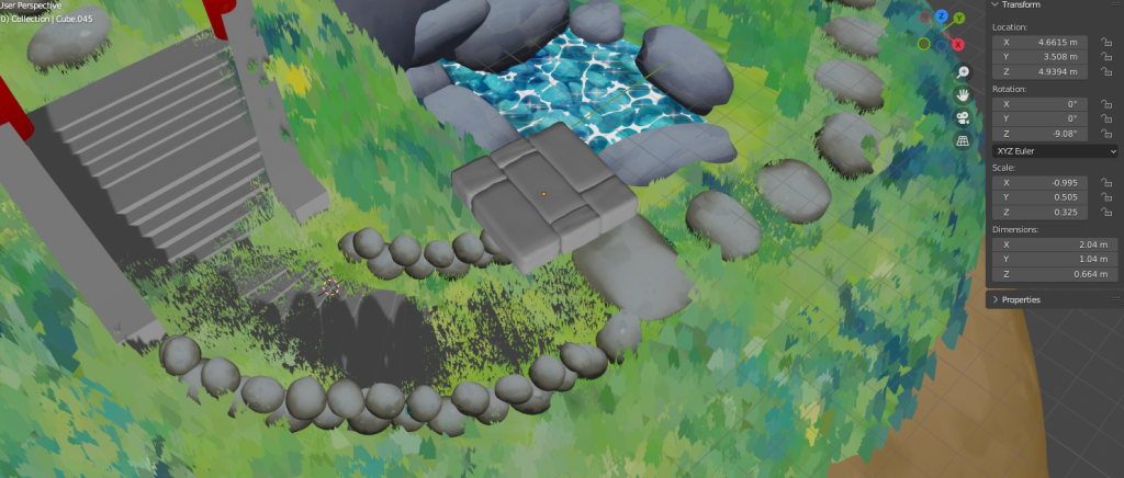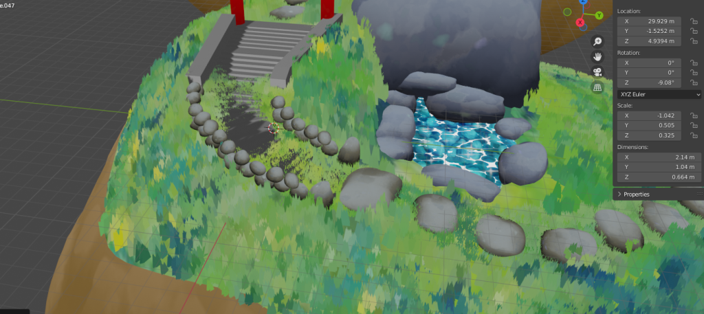I once again decided that some of these materials could be changed so I added the Stepping Stone with moss texture for the stairs and barrier along with replacing some of the stepping stones themselves.
