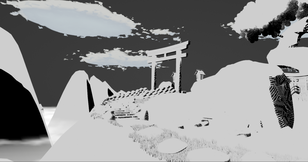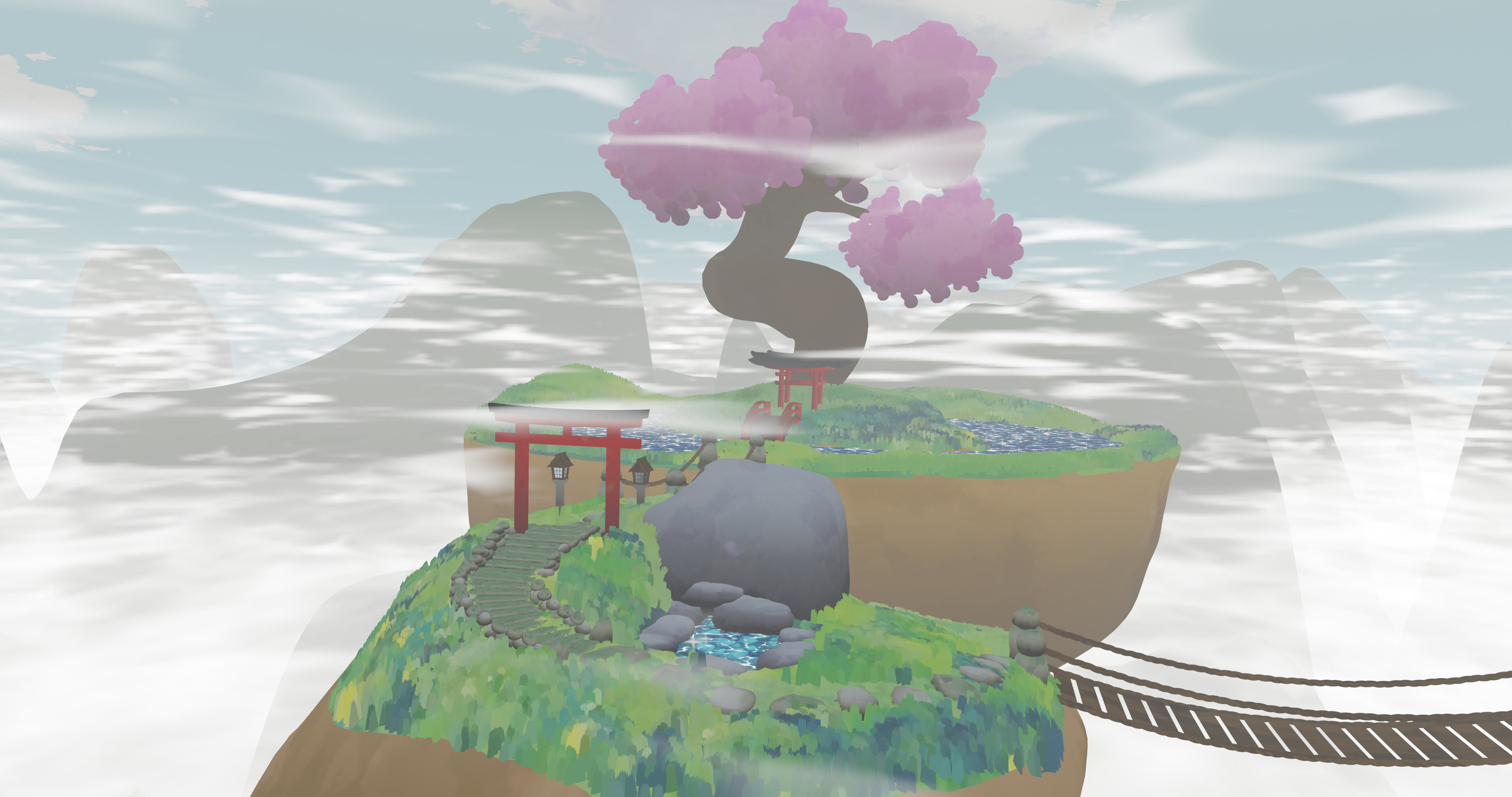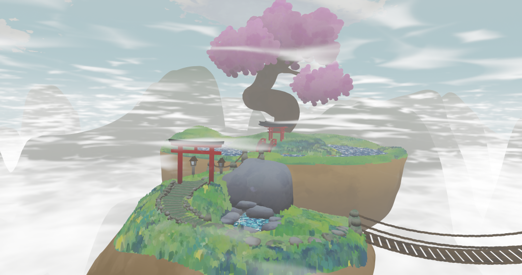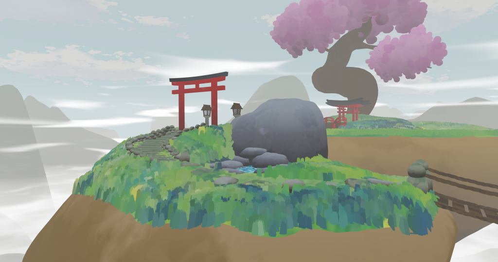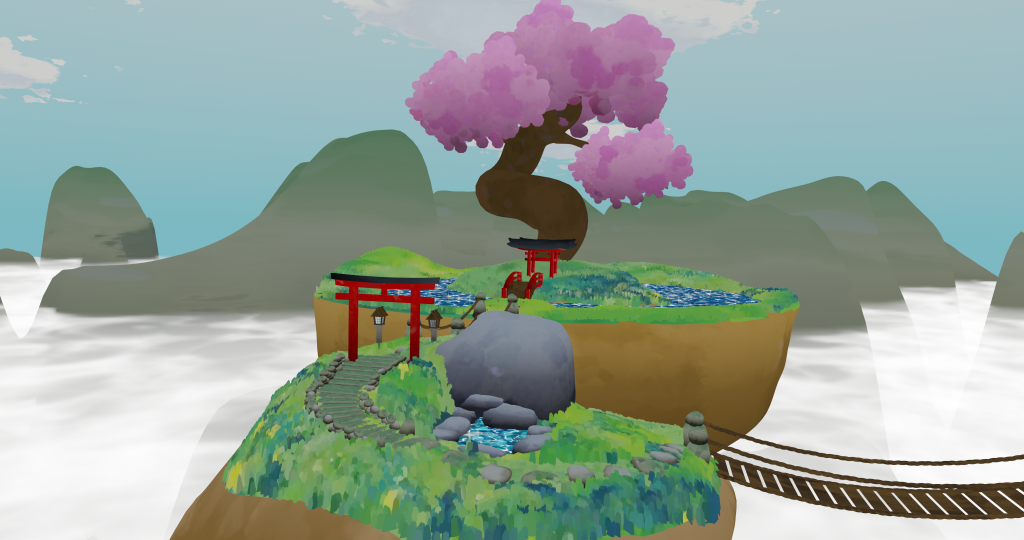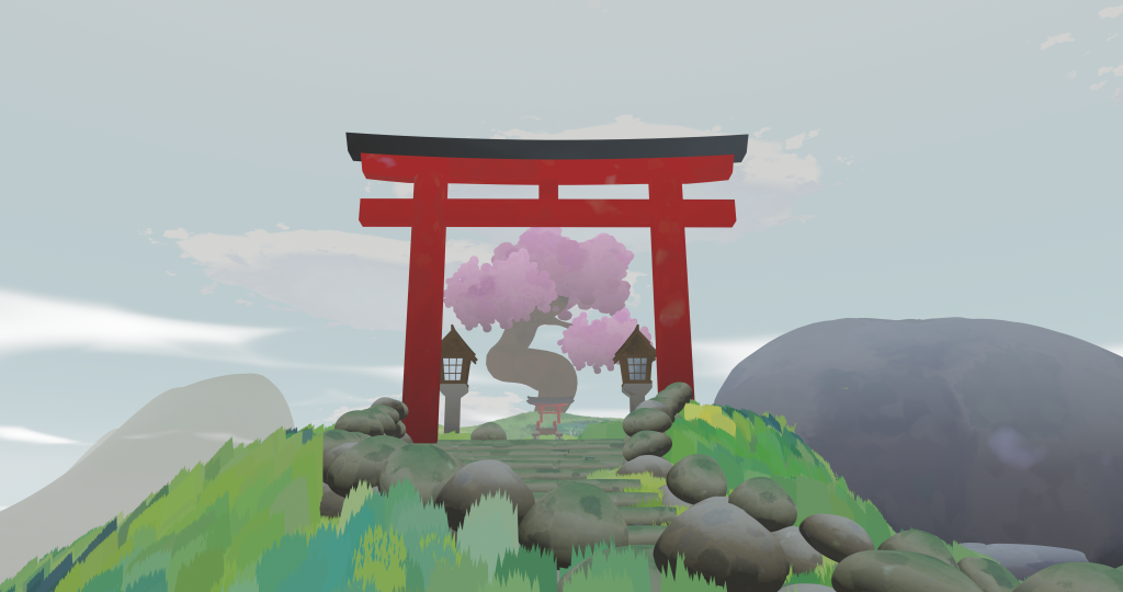 In this shot to create a sense of depth I used a frame within a frame, even when making the scene ill always planned to use the torii in this way, but the secret of this scene lies with the positioning of the space inside the torii. With the normal layout this shot isn’t actually possible as the torii cant enclose the whole tree cleanly, therefore unbeknownst to the viewer, I moved the second island further back to a position that would fit in the frame. This highlights my earlier point, in the real world this wouldn’t be possible as you can’t physically move structures to your liking however in a virtual space you can, while still keeping a relatively similar-looking scene.
