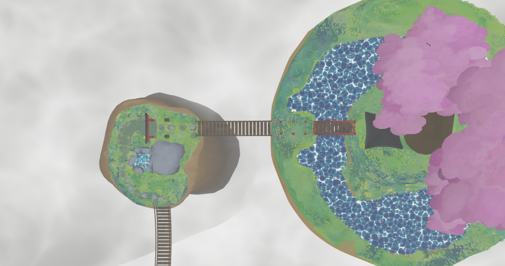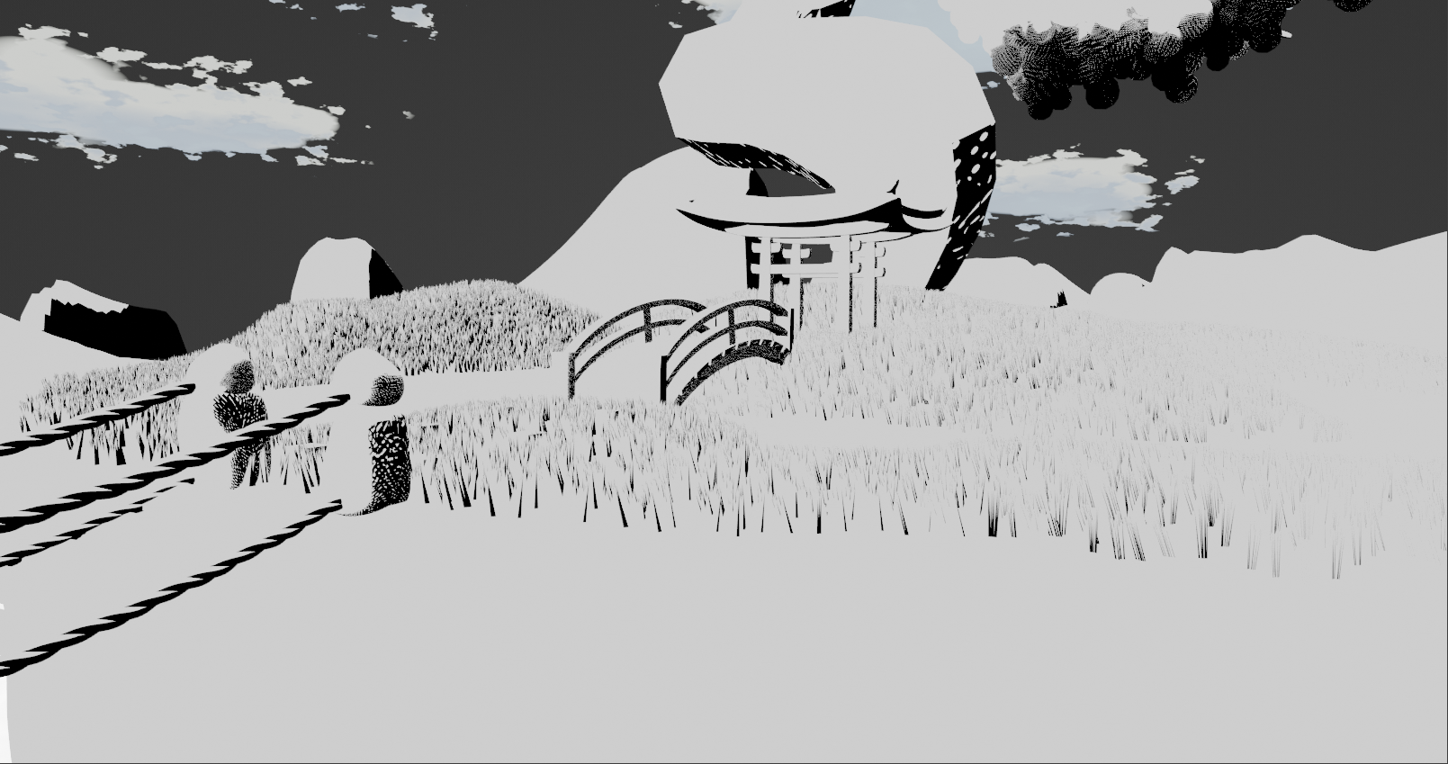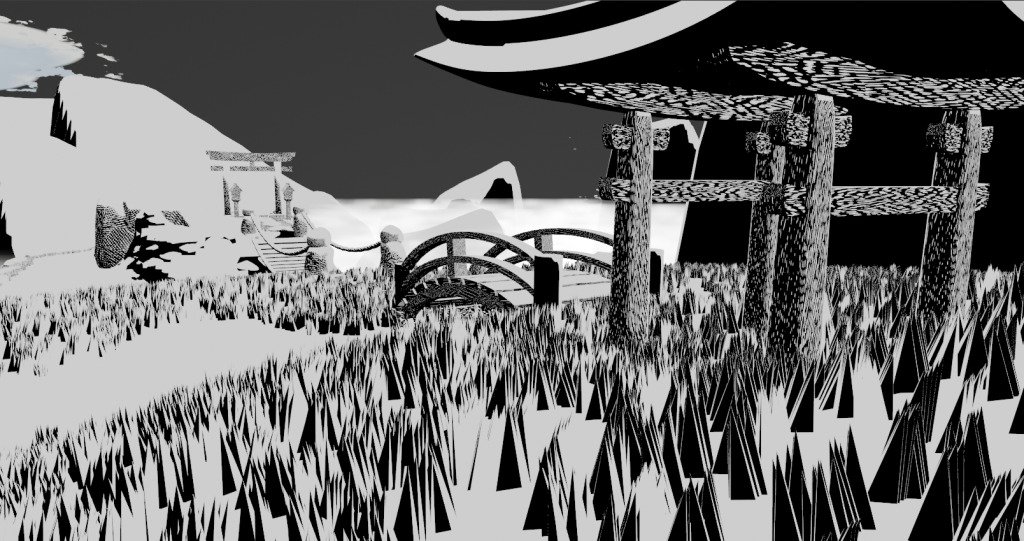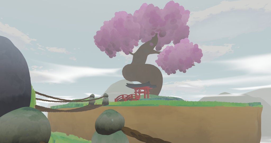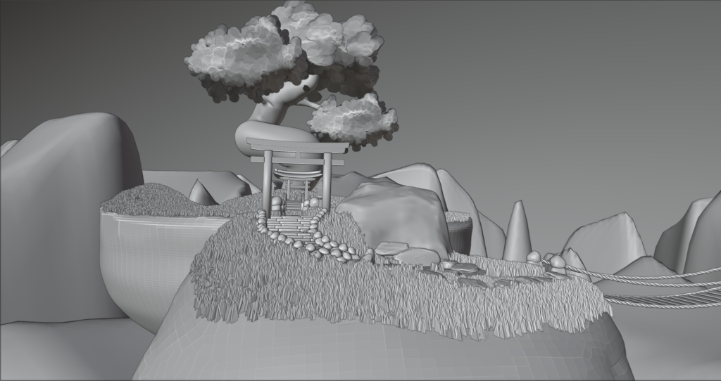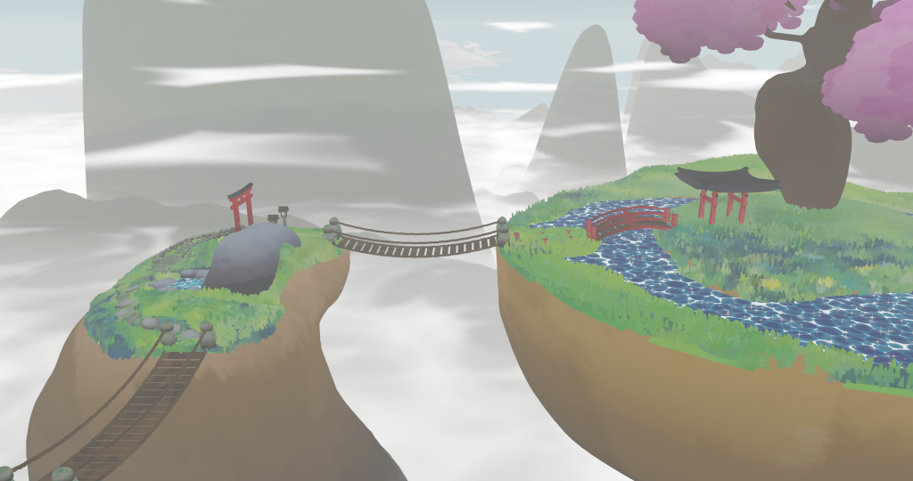 In this shot to create a sense of depth I used a frame within a frame, even when making the scene ill always planned to use the torii in this way, but the secret of this scene lies with the positioning of the space inside the torii. With the normal layout this shot isn’t actually possible as the torii cant enclose the whole tree cleanly, therefore unbeknownst to the viewer, I moved the second island further back to a position that would fit in the frame. This highlights my earlier point, in the real world this wouldn’t be possible as you can’t physically move structures to your liking however in a virtual space you can, while still keeping a relatively similar-looking scene.